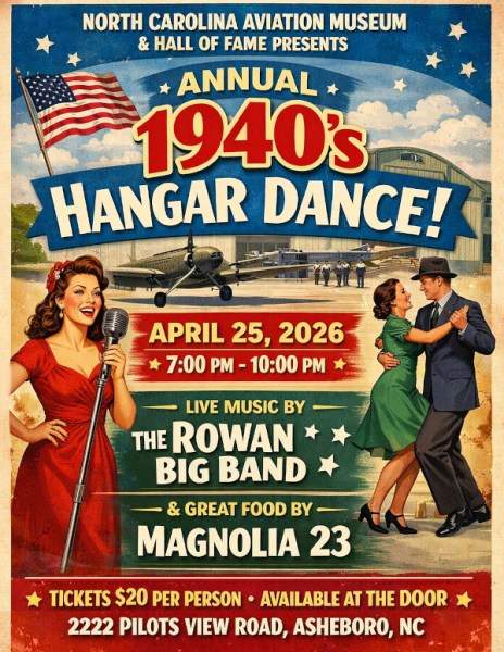 The North Carolina Aviation Museum & Hall of Fame is hosting the annual 1940’s Hangar Dance on Saturday, April 25th. The event will take place from 7:00PM-10:00PM at 2222 Pilots View Road in Asheboro. Guests can enjoy a night of swing dancing to live music provided by The Rowan Big Band. Dinner will be catered by Magnolia 23, featuring their well-known local cuisine. While 1940s-style attire is optional, attendees are encouraged to dress in vintage outfits to add to the festive atmosphere.