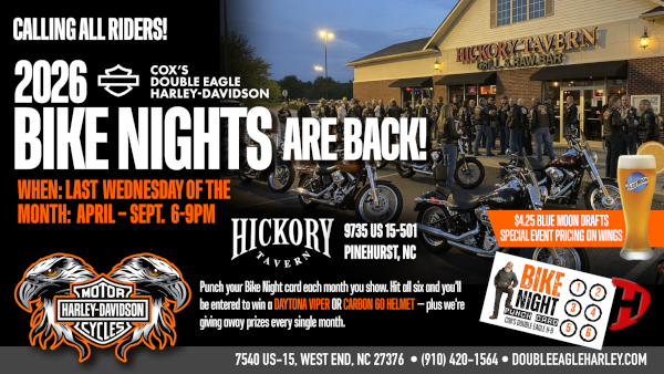 Join at Cox’s Double Eagle Harley-Davidson Wednesday, April 29th from 6PM-9PM at Hickory Tavern in Pinehurst as the 2026 Bike Night Series kicks off. This event is part of the 2026 Bike Night Series, hosted the last Wednesday of every month from April-September, 6PM–9PM, at Hickory Tavern in Pinehurst. This isn’t a one-time ride-in. It’s six rounds. One season. No resets. When you roll in, grab your official 2026 Bike Night Punch Card and commit to the series. Your physical card must be present each month to receive a punch. No replacements. No duplicates. No exceptions.