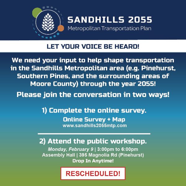 “Due to inclement weather, the Sandhills MPO Metropolitan Transportation Plan (MTP) Public Workshop originally scheduled for Monday has been rescheduled to Monday, February 9.”