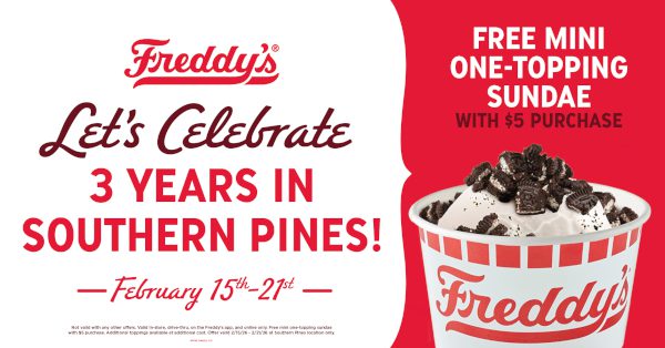 Come celebrate three years in Southern Pines at Freddy’s from February 15th-21st. During this anniversary week, you can receive a free mini one-topping sundae with any $5 purchase. If you stop by on February 15th, you will also have a chance to win some Freddy’s swag while supplies last. This offer is valid in-store, at the drive-thru, or on the Freddy’s app and website, exclusively at the Southern Pines location!