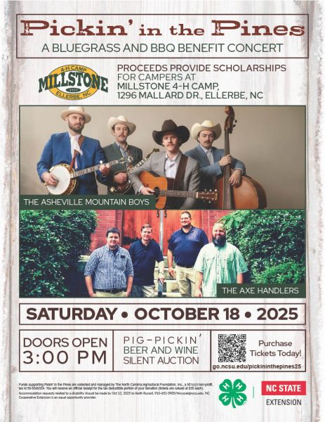 Join on Saturday, October 18th for the 7th Annual Pickin’ in the Pines Bluegrass and BBQ event at Millstone 4-H Camp in Ellerbe. The event includes an evening of first-class live Bluegrass music with headlining bands, “The Asheville Mountain Boys” from western North Carolina, and “The Axe Handlers” from central North Carolina.