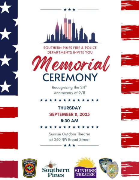 The community is invited to come together for the 9/11 Memorial Ceremony. The Southern Pines Fire and Police Departments will lead the Remembrance Ceremony beginning at 8:30am on the outdoor Sunrise Theater Stage. This year’s ceremony recognizes the 24th anniversary of September 11th.