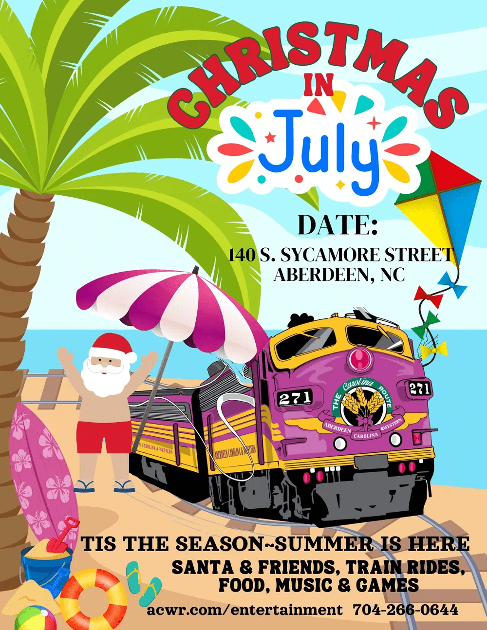 Hop on with Aberdeen Carolina & Western Railway for Christmas in July on Saturday, July 18th! Beat the Heat with the Grinch! Join Santa for holiday storytelling, play reindeer games, and enjoy cold treats — a fun summer twist on the holidays!