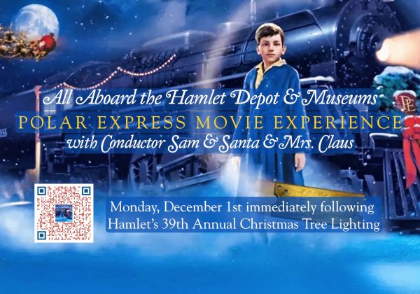 Enjoy the All Aboard the Hamlet Depot and Museums Polar Express Movie Experience immediately following the 39th Annual Christmas Tree Lighting in Main Street Park on the evening of Monday, December 1st. This free magical movie experience will take place in the Hamlet Historic Depot. Outside the Depot, hot cocoa and cookies will be provided complimentary of Hamlet Fire Rescue and EMS, and there will be a snow making machine. Official Polar Express Movie Tickets will be given out and punched by Conductor Sam to watch the movie in the Depot Passenger Waiting Area.