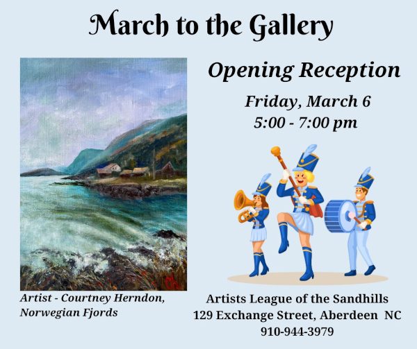 Shake off the winter chill! The Artists League of the Sandhills presents the “March to the Gallery” Exhibit! View this exhibit at the Exchange Street Gallery of Fine Art from March 6th-March 27th. An Opening Reception with the artists will take place on Friday, March 6th from 5:00pm-7:00pm. The weather is changing, but no matter what, the gallery offers a warm and welcoming environment to enjoy and support local art. For more details, you can contact the league at 910-944-3979.
