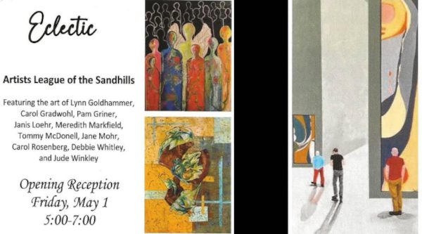 The Artists League of the Sandhills invites you to “Eclectic,” a vibrant exhibition featuring colorful works by 10 talented local artists: Lynn Goldhammer, Carol Gradwohl, Pam Griner, Janis Loehr, Meredith Markfield, Tommy McDonell, Jane Mohr, Carol Rosenberg, Debbie Whitley, and Jude Winkley.