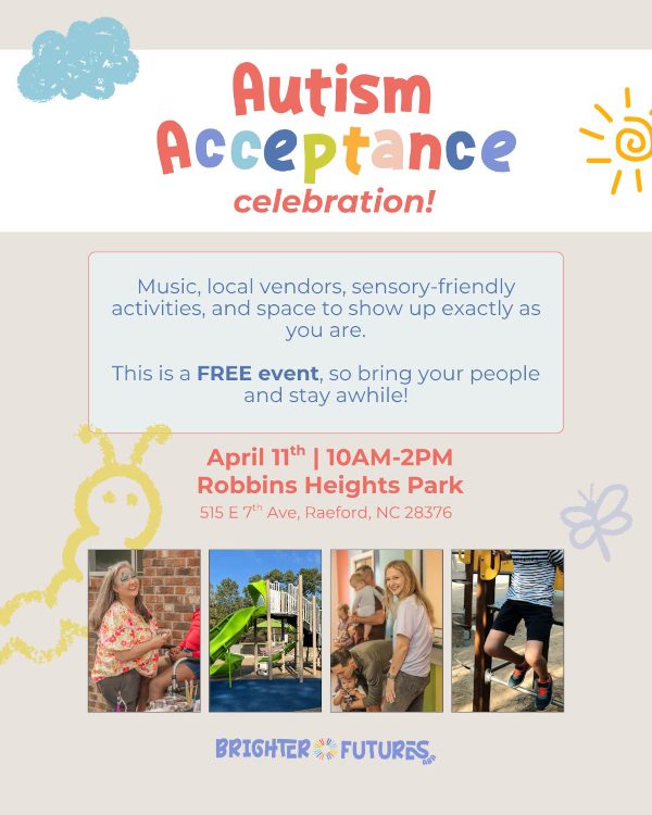 Brighter Futures Therapy Services, LLC is thrilled to invite the community to Robbins Heights Park in Raeford for their 1st Annual Autism Acceptance Celebration held in honor of Autism Acceptance Month. As a small, locally owned ABA clinic, they have designed this event to celebrate the unique strengths and individuality of children with autism and their families in a fun and welcoming environment. Join on Saturday, April 11th, 10AM-2PM.