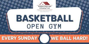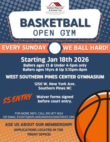 Basketball Open Gym is back at the West Southern Pines Center Gymnasium! Starting January 18th, enjoy some playtime every Sunday from 4pm-5pm for ballers ages 13 and under and 5:15pm-8:00pm for ballers ages 14 and up. Entry is $5, and all participants must sign a waiver upon arrival before stepping on the court, with those 18 years or younger requiring a parent or legal guardian’s signature. Come out, get active, and enjoy a safe, positive space for community hooping, or ask about our open gym membership with applications available in the front office. For more information, you can call 910-877-1654 or email events@splandandhousingtrust.org.