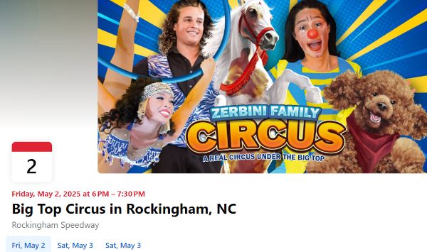 The Big Top Circus is coming to the Rockingham Speedway and Entertainment Complex! Enjoy a 90-minute performance under the Big Top! The Zerbini Family Circus under the Big Top!