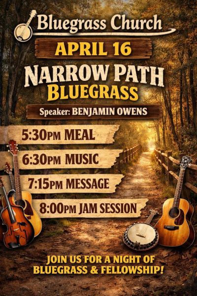 Join Middle Cross Baptist Church in West End this Thursday, April 16th for Bluegrass Church! Join for an evening of food, music, worship and fellowship.