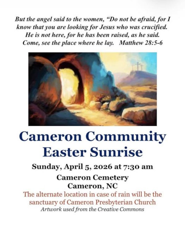 Gather with neighbors for the Cameron Community Easter Sunrise service on Sunday, April 5th. The morning begins at 7:30AM at the Cameron Cemetery, offering a peaceful setting to reflect. In the event of rain, the service will move to the sanctuary of Cameron Presbyterian Church so the community can still come together regardless of the weather.