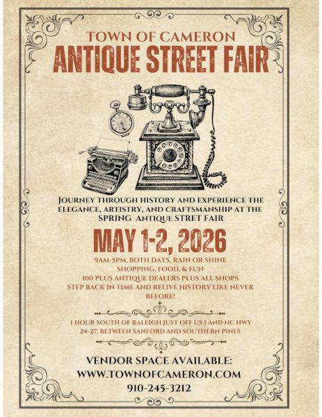 Step by in time and relive history like never before! The 2026 Cameron Spring Antiques Street Fair takes place on Friday, May 1st & Saturday, May 2nd, from 9AM-5PM each day in Historic Downtown Cameron! Celebrating over 40 years of bi-annual antique street fairs! Enjoy shopping all antique stores plus the over 100 vendors. It is a favorite Moore County event that includes shopping, great food and fun for the whole family. This is a rain or shine event.