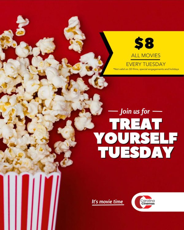 Treat Yourself Tuesday at Carolina Cinemas with a special deal on movie tickets! You can enjoy any standard film for just $8 all day long every Tuesday. Please keep in mind that this offer excludes 3D screenings, special engagements, and holidays. To purchase your movie tickets, CLICK HERE.