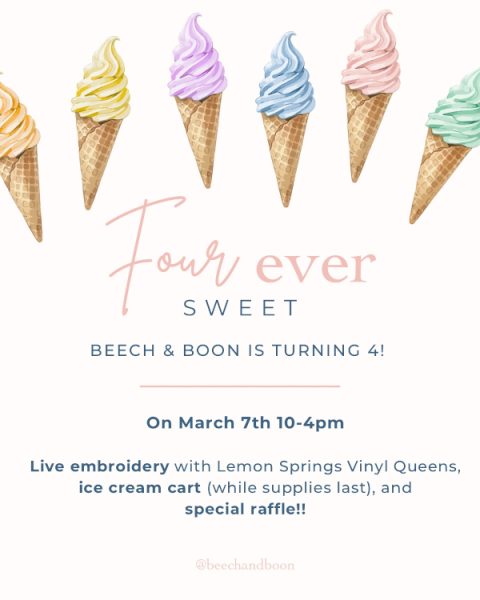 Join the community on Saturday, March 7th from 10:00AM-4:00PM to celebrate Beech & Boon turning four with a “Four Ever Sweet” anniversary event. Shoppers can get a head start on the season by browsing fresh spring arrivals and preparing their Easter baskets while enjoying a variety of special on-site activities.