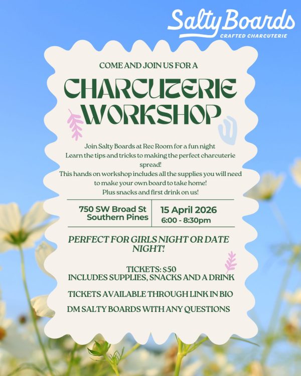 Grab your friends and join us on Wednesday, April 15th at Rec Room in Southern Pines for a fun, hands-on charcuterie workshop from 6:00PM-8:30PM! You will be guided step-by-step as you create your own stunning board—no experience needed. All supplies are included for $50, plus you’ll enjoy snacks and a drink from the bar. Best part? You’ll leave with your very own charcuterie board to take home!