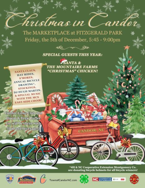 Celebrate the holidays at Christmas in Candor on Friday, December 5th, from 5:45pm-9:00pm at The Marketplace at Fitzgerald Park. This festive evening will feature a variety of activities for all ages including visits with Santa Claus and The Mountaire Farms “Christmas” Chicken! Attendees can enjoy hay rides, s’mores, and receive stockings. There will also be the annual bicycle drawing, with 4H and NC Cooperative Extension Montgomery Co. donating bicycle helmets for all winners. Enjoy special entertainment including DJ Hugh Martin and special music from the MCS East-Side Choir. The Candor Lions Club and Bloom & Brew Coffee Co. will be on site providing food and beverages.