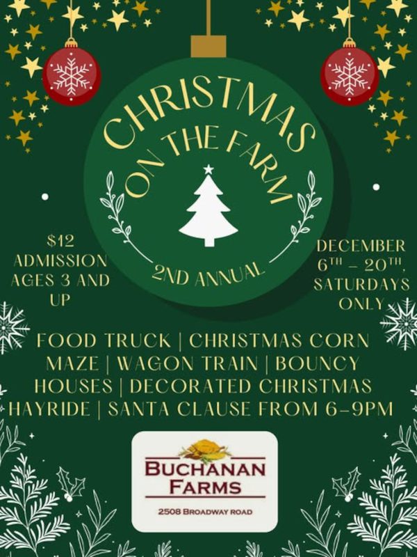 Buchanan Farms in Sanford is hosting the 2nd annual Christmas on the Farm event on Saturday, December 6th, 13th, & 20th. Get in the holiday spirit with the Christmas corn maze, a wagon train, bounce houses, the decorated Christmas hayride and more! Be sure to bring your camera as Santa Claus will be visiting from 6:00pm-9:00pm. A food truck will also be on site for the fun. Admission is $12 for ages 3 and up.