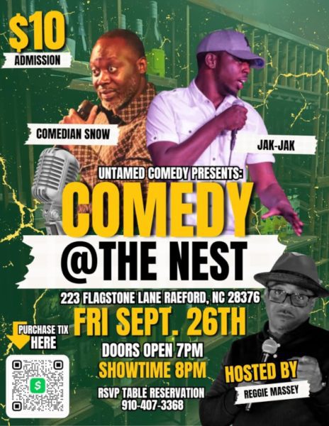 Get ready for a On Friday, September 26th, come out for a comedy show at 1910 Wine Nest hosted by Reggie Massey, featuring hilarious performances by Comedian Snow and Jak-Jak. Doors open at 7:00pm, with the show starting at 8:00pm. Admission starts at $10 per person, and tables are available for an additional fee. Secure your tickets through the QR code on the flyer or call 910-407-3368 for table reservations.