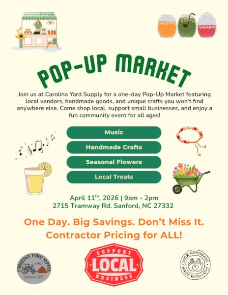 Carolina Yard Supply in Sanford is hosting a fun, community Pop-Up Market on Saturday, April 11th, from 9:00AM-2:00PM. There will be a great mix of local vendors, makers, and small businesses for a great day of shopping, connecting, and supporting local! Plus, shop special sales on landscape materials—so everyone can take advantage of Contractor Pricing! Enjoy music and shop handmade crafts, seasonal flowers, and local treats.