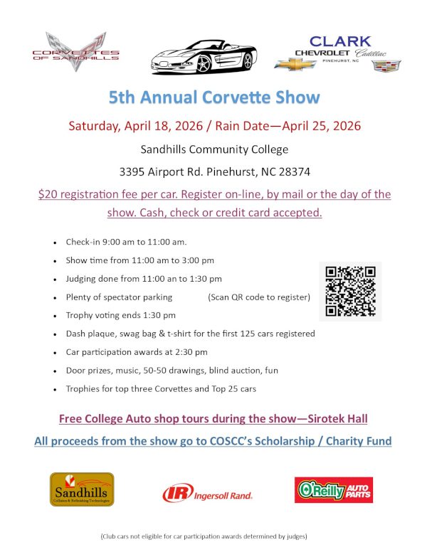 Join as Corvettes of the Sandhills presents the 5th annual Corvette Show on Saturday, April 18th at Sandhills Community College! This event brings together Corvette enthusiasts for a full day of cars, community, and automotive fun, with plenty of new surprises in the works to help you get your fix of automotive information. In addition to the Corvette show, there will also be an all-mark cruise-in on the adjacent property, making it a great day for all car lovers to attend. Spectators are encouraged to come out and enjoy viewing the corvette show and cast their vote. There will be a silent auction, 50/50 raffle, door prizes, music and fun. Food trucks will be on site and auto shop tours will be going. Benefiting COSCC Scholarship / Charity Fund. All proceeds from the show go toward supporting scholarships and charitable efforts, helping students and the community through funds raised during the event. Rain date is Saturday, April 25th.