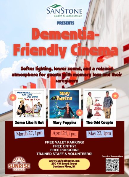 SanStone Health & Rehabilitation presents a series of Dementia-Friendly Cinema events at the Sunrise Theater, designed specifically for guests with memory loss and their caregivers. These screenings feature softer lighting, lower sound, and a relaxed atmosphere to ensure a comfortable experience for all attendees.