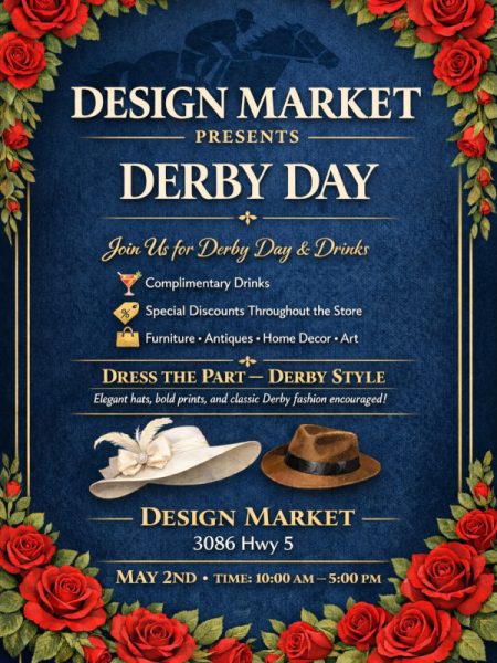 Design Market in Aberdeen invites you to join them for Derby Day and Drinks on Saturday, May 2nd, from 10AM-5PM at 3086 Highway 5. Dress the part in elegant hats, bold prints, and classic Derby fashion while enjoying complimentary drinks and special discounts throughout the store. Whether you are looking for furniture, antiques, home decor, or art, it is a perfect day to sip, shop, and discover something unique in a fun, stylish atmosphere.