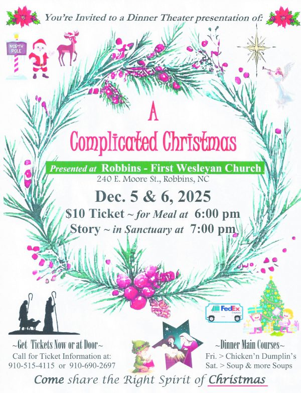 Attend a special Dinner Theater presentation of “A Complicated Christmas” at Robbins – First Wesleyan Church on Friday, December 5th and Saturday, December 6th. The Dinner Meal is served at 6:00pm for a ticket price of $10. Dinner main courses include Chicken ‘n Dumplin’s on Friday and Soup & more Soups on Saturday. The Story will be presented in the Sanctuary at 7:00pm. Tickets can be purchased now or at the door. You can call 910-515-4115 or 910-690-2697 for ticket information. Come share the Right Spirit of Christmas!