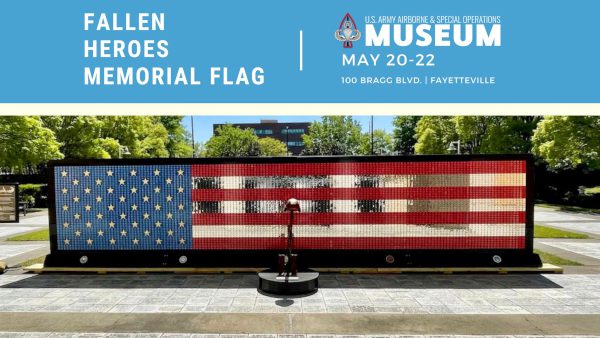 During All-American Week, May 20th-22nd the Airborne & Special Operations Museum Foundation will host the traveling Fallen Heroes Memorial exhibit in the Museum’s Reflection Garden. This 28-foot wide by 6-foot-tall American flag symbolizes the shape of the flag when draped on a fallen service members casket. It is formed of over 7,000 dog tags of all those who have fallen in the War on Terror.