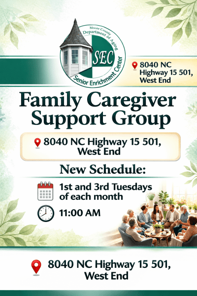 Please join at the Senior Enrichment Center of Moore County for an opportunity to share your feelings, develop friendships, receive Emotional support, and discuss solutions to common Caregiver issues with other Caregivers. The group is held every third Tuesday of the month from 11AM-12PM. To reserve your seat, call or email Alveda Person, Family Caregiver Advisor at 910-947-4186 or aperson1@moorecountync.gov.