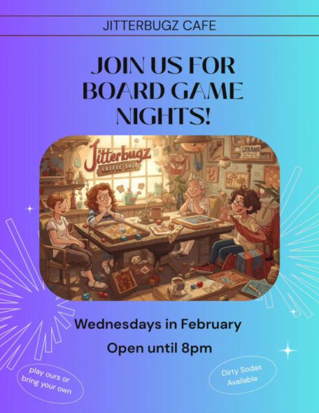 Jitterbugz Cafe is inviting everyone to join for Board Game Nights every Wednesday in February! The cafe will be open until 8pm to play their games or bring your own games while sipping on the dirty sodas available. Whether you are looking for a mid-week break or a way to connect with friends over a classic tabletop challenge, come sit with us for a night of gaming and refreshments throughout the month.