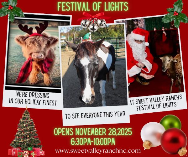 Come out for the 6th annual Festival of Lights at Sweet Valley Ranch NC in Fayetteville! Guests will enjoy a beautiful drive through light show. Join in on the festive celebration. The farm will be transformed into a magical Christmas Wonderland featuring a dazzling display of over 20 themed areas, including Santa’s Backyard, The Land of Enchantment, Haybarn, Dino Field, Gingerbread House and the Dino Field. The animals will be dressed in their holiday finest!