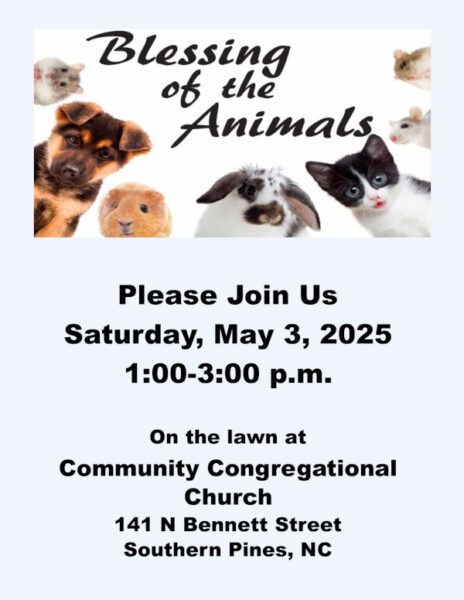 Bring your pet or a photo of your pet to the Community Congregational Church of Southern Pines’ first “Blessing of the Pets” Service this Saturday, May 3rd | 1pm-3pm on the front lawn.