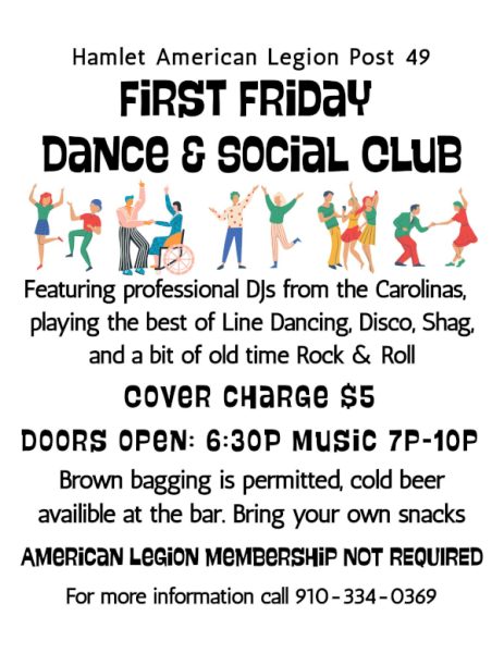 Hamlet American Legion Post 49 invites you to the First Friday Dance & Social Club, featuring professional DJs from the Carolinas playing the best of line dancing, disco, shag, and old-time rock and roll! Doors open at 6:30pm with music from 7:00pm-10:00pm. There is $5 cover charge; American Legion membership is not required to attend. For more information, call 910-334-0369.