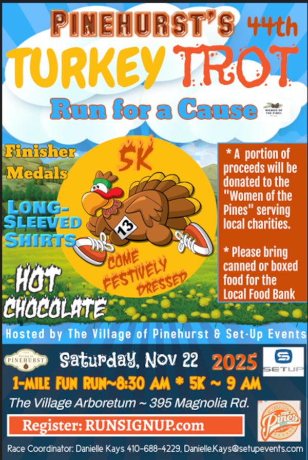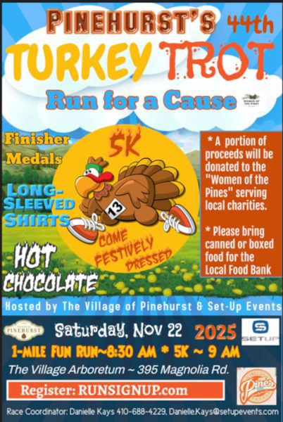 Running for a cause; join in giving back! “Become a Part of the Tradition and the oldest Turkey Trot in NC!” The 44th annual FirstHealth Pinehurst Turkey Trot 5K & Fun Run and The Little Gobbler-1 Mile Fun Run takes place on Saturday, November 22nd! The FirstHealth Pinehurst Turkey Trot begins at The Village Arboretum, presented by the Village of Pinehurst and Set Up Events. Runners will trek through the streets and residential neighborhoods of the Village. Runners are encouraged to come festively dressed to make the run extra fun! All finishers receive a hot chocolate and a metal.