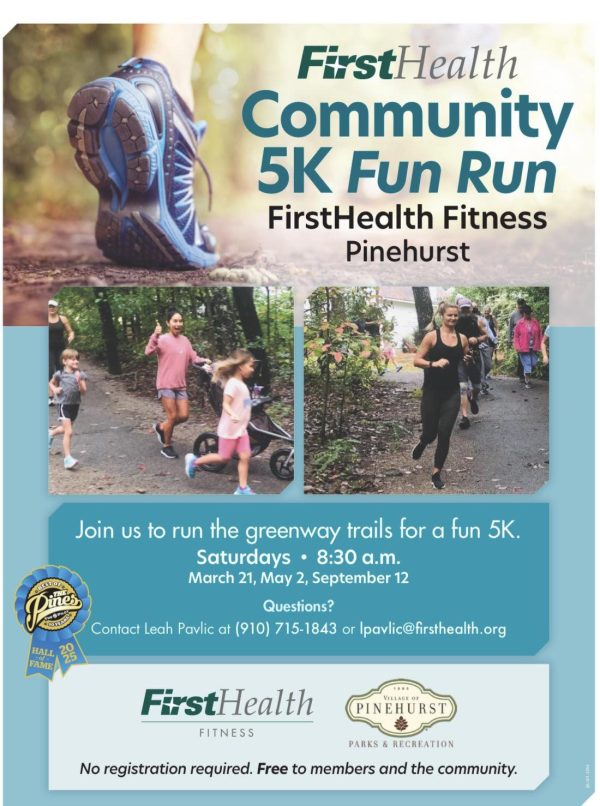 Join FirstHealth Fitness in Pinehurst this Saturday, March 21st at 8:30am for a free 5k Fun Run! This is a no frills, timed event on the Greenway Trails. No registration required. Open to members and the community.