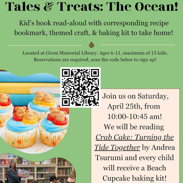 Children are invited to Given Memorial Library for Tales and Treats on Saturday, April 25th, from 10:00AM-10:45AM! The program is for children ages 6-11 and there is a maximum of 15 kids. Enjoy a kid’s read aloud session with corresponding recipe bookmark, craft and a baking kit to take home. Registration is required.