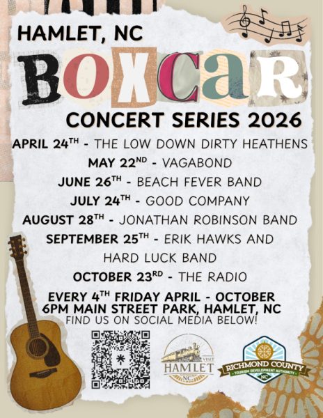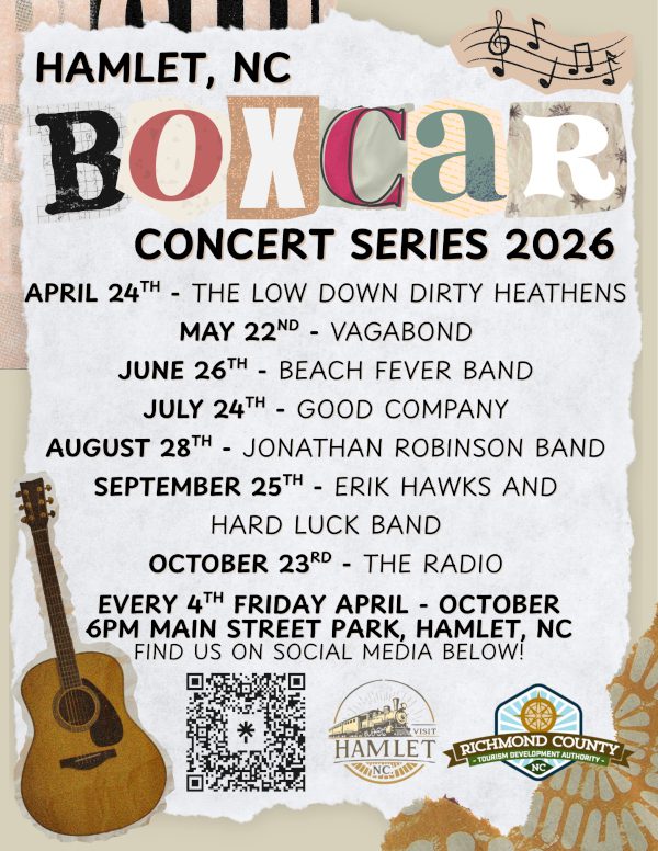 Come out for the town of Hamlet’s Boxcar Concert Series 2026, taking place on the fourth Friday of every month starting April-October, during the TGIFood Truck Fridays. Each performance begins at 6:00pm and features a different local or regional musical act. Experience live music at this fun family event.