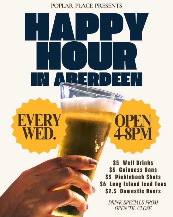 Poplar Place is introducing a new weekly Happy Hour in Aberdeen every Wednesday, starting April 1st, from 4PM-8PM with drink specials running from open until close. Featured deals include $2.50 domestic beers, $5 well drinks, $5 Guinness cans, $5 pickleback shots, and $6 Long Island iced teas.