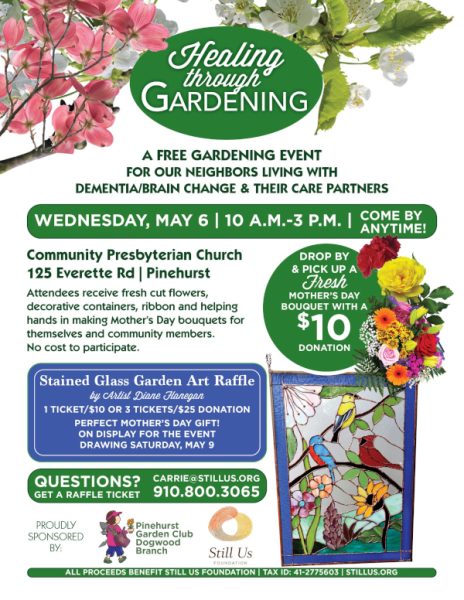 Join for a special “Healing Through Gardening” event on Wednesday, May 6th at the Community Presbyterian Church in Pinehurst. This gathering is designed specifically for neighbors living with dementia or brain change, along with their care partners. The event runs from 10:00AM-3:00PM at 125 Everette Road in Pinehurst, and guests are welcome to drop by at any time throughout the day.