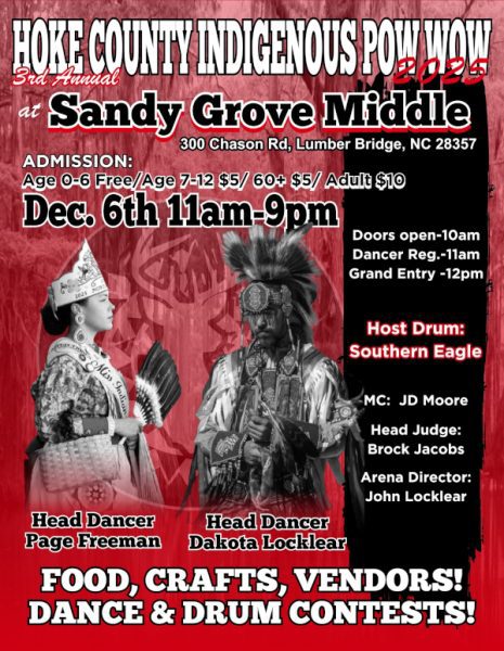 The 3rd Annual Hoke County Indigenous Pow Wow will be held at Sandy Grove Middle in Lumber Bridge on December 6th from 11:00am-9:00pm! The event will feature food, crafts, and vendors, along with exciting dance and drum contests. The event staff includes Host Drum: Southern Eagle, MC: JD Moore, Head Judge: Brock Jacobs, Arena Director: John Locklear, and Head Dancers: Page Freeman and Dakota Locklear.