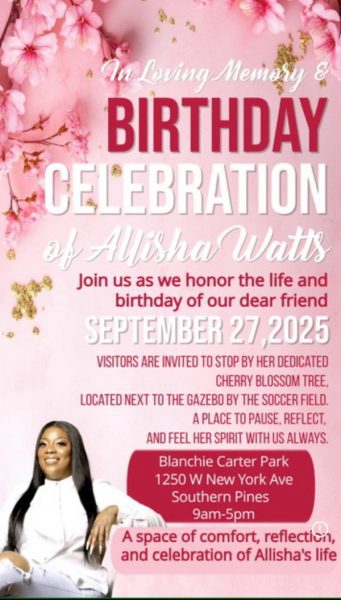 In loving memory, family and friends will gather on Saturday, September 27th at Blanchie Carter Park to celebrate the life and birthday of Allisha Watts. Visit anytime between 9am-5pm at her dedicated Cherry Blossom Tree, beside the gazebo near the soccer field, to pause, reflect, and honor her beautiful spirit.