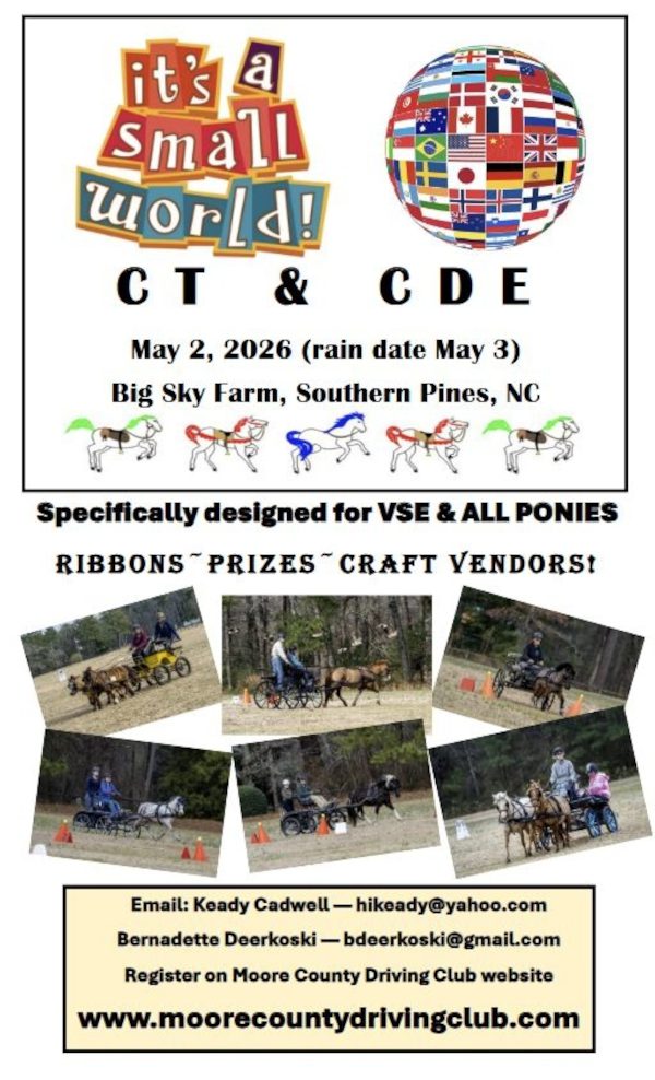 The Moore County Driving Club is hosting “It’s a Small World!” CT & CDE at Big Sky Farm in Southern Pines on Saturday, May 2nd, from 9AM-3PM with a rain date scheduled for Sunday, May 3rd. Specifically designed for Very Small Equines (VSE) and all ponies, this unique driving competition will feature ribbons, prizes, and a variety of craft vendors for attendees to enjoy.