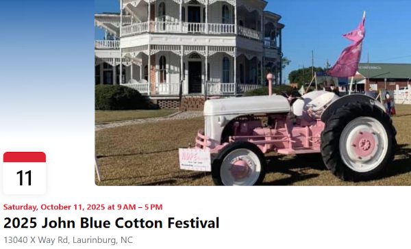 Come out for the 2025 John Blue Cotton Festival in Laurinburg on Saturday, October 11th | 9:00am-5:00pm! This annual festival takes place on the grounds of the historic John Blue home. A family-oriented, old-timey fair, this festival offers activities all ages. There will be tours available of the 1800s cabins, exhibits, a mule powered cotton gin, antique tractors, hit and miss engines, train rides, live music & entertainment, a museum, crafts, hayrides, pony rides, children’s games and many food options on site. Cost of admission is $5; children under five admitted for free.