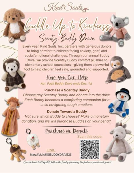 Kind Souls, Inc. is holding its annual Scentsy Buddy Drive to provide comfort plushies to elementary school counselors. These “Buddies” are a powerful tool to help children navigate anxiety, grief, and social-emotional challenges, helping them feel safe and supported.