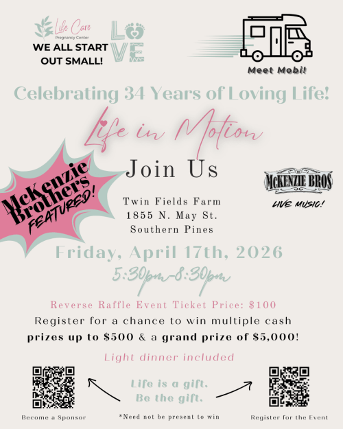 The Life Care Pregnancy Center is celebrating its 34th anniversary and the launch of its new mobile unit, Mobi, with a “Life in Motion” reverse raffle fundraiser on Friday, April 17th! The event will be held from 5:30PM-8:30PM at Twin Fields Farm, located at 1855 N. May St. in Southern Pines.