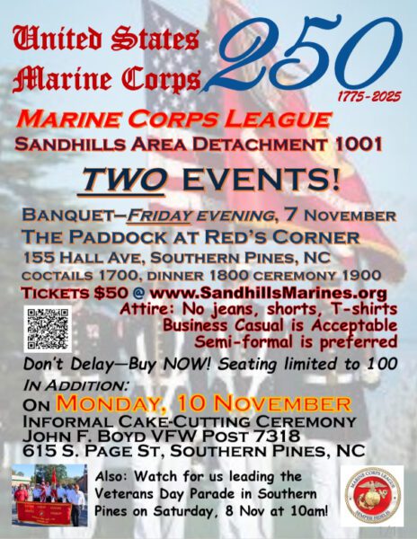 Join the Marine Corps League Sandhills Area Detachment 1001 as they celebrate the 250th Birthday of the United States Marine Corps with two special events!
