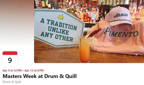 Drum & Quill Masters Week is a tradition like no other in the Sandhills. Not only every swing on TVs and 4K Big Screen with sound, but also Masters cocktail specials and of course pimento cheese sandwiches!