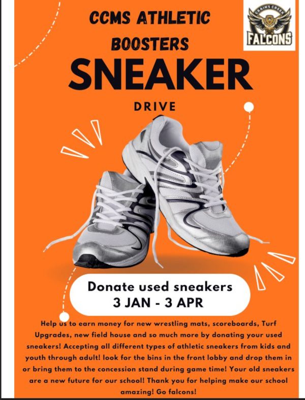 The Crains Creek Middle School Athletic Boosters are hosting a Sneaker Drive from January 3rd-April 3rd to support the school’s athletes. All types of athletic sneakers ranging from kids and youth sizes to adult sizes are being collected. Your donations will help fund essential improvements like new wrestling mats, scoreboards, turf upgrades, and a new field house. Bring your used sneakers to the bins located in the front lobby or drop them off at the concession stand during game time. Every pair donated helps build a better future for the Falcons!