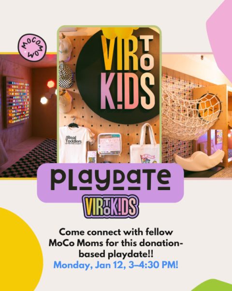 VirtoKids is hosting a special to a donation-based indoor playdate with the MoCo Mom group on Monday, January 12th from 3:00pm-4:30pm. Families can mix, mingle, and let the kids play during the post-nap window. Toddlers, tinies, and all families are welcome. Reservations and donations can be made through the event website link provided below.