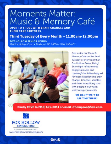 Join at Fox Hollow Senior Living for Moments Matter: Music & Memory Café, an uplifting hour open to individuals experiencing brain changes and their care partners. This event is held on the Third Tuesday of every month from 11:00am-12:00pm. It’s a chance to connect, socialize, and share with others in a warm, welcoming community. You can enjoy light refreshments, engaging music, and meaningful activities designed for those experiencing brain change.